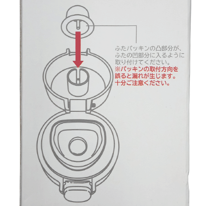 飲み口上部のパッキンはあまり見ない形ですが、取り付け方が箱の側面に記載されています。