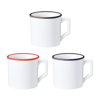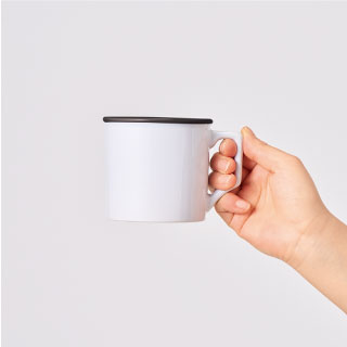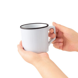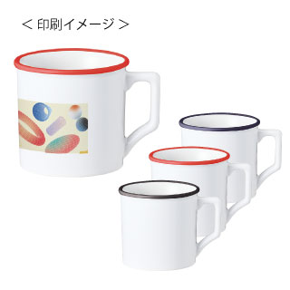口元をふっくらとさせた優しげなデザインはホーロー製のマグカップの定番です。陶器で仕上げ、側面に昇華転写のフルカラー印刷が出来るようにしました。口元の差し色がポイントで、色違いで揃えても愛らしいデザインです。Mサイズは、容量330mlにサイズアップしました。側面がホワイトボディのため、フルカラー昇華転写印刷にも対応しており、オリジナルグッズ製作向けに大人気の商品です。学校や企業の記念品をはじめ、キャラクターやイラストなどをプリントした物販品、ノベルティにもおすすめです。