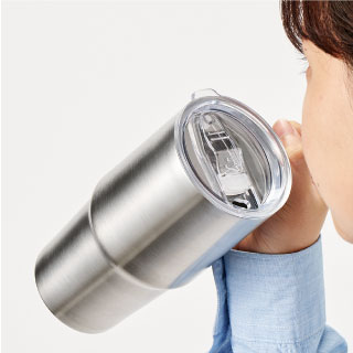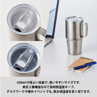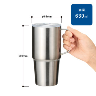 日常使いにぴったりなトレンドのトールマグです。650mlでレジャーからデスクワークのお供まで幅広く使いやすいサイズ感です。どなたでも持ちやすいように、ゆとりを持ったハンドルサイズに設定いたしました。本体は真空2層構造になっており、長時間の保冷保温効果もあります。またフタはスライド式で開閉でき、飲まないときは閉めておけるので衛生的です。