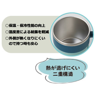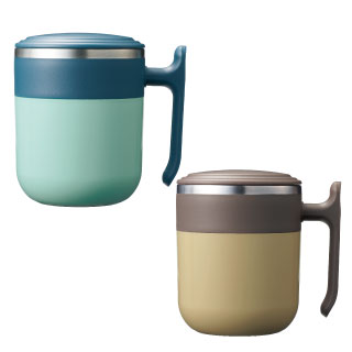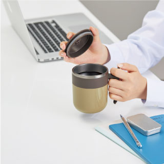 ステンレス二重構造&こぼれにくいフタ付き。他にはないT型グリップ形状が特徴的で、デスクワークやアウトドアなど様々な場面で活躍。