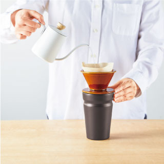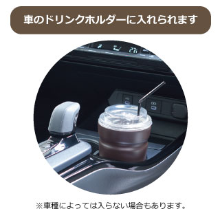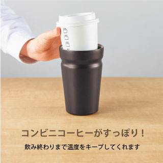 コンビニやコーヒーチェーン店のカップが入る、持ちやすい形状の真空ステンレス製タンブラー。車内ドリンクホルダーにも対応しています。