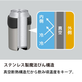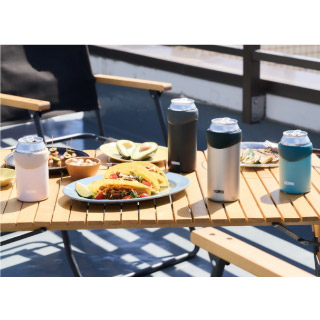 ステンレス製の真空断熱構造により、缶飲料の冷たさをしっかりキープする保冷缶ホルダーです。外気の影響を受けにくく、氷を入れなくても飲み頃の冷たさを長時間保ち、結露しにくいので手やテーブルを濡らしません。缶をそのままセットするだけで簡単に使え、デスクワークやアウトドア、BBQなどさまざまなシーンで活躍します。350ml缶に対応した使いやすいサイズで、日常のドリンクタイムにぴったりです。同シリーズで500ml缶用もございます。
