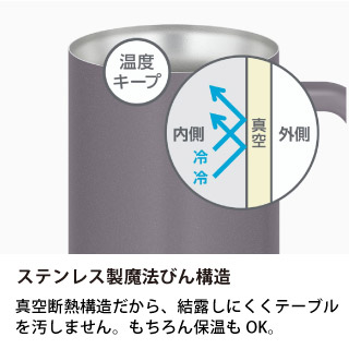 ステンレス製の真空断熱構造を採用し、冷たい飲み物の冷たさを長時間キープできるジョッキです。結露しにくく、氷を入れても冷たさが続くため、最後までおいしく楽しめます。丈夫なハンドル付きで持ちやすく、家飲みやパーティー、アウトドアシーンにも活躍します。720mlの大容量タイプで、たっぷり飲みたい方や長時間の使用にも安心のサイズです。同シリーズで600mlサイズもございます。